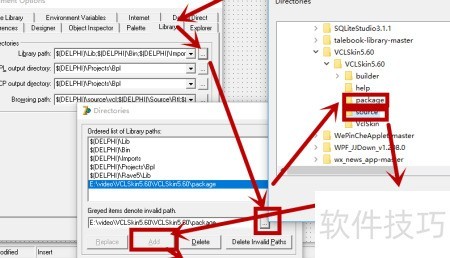 2、 以管理员权限启动Delphi 7,依次点击菜单栏中的Tools→Environment Options,进入Library选项卡,找到Library path项,点击右侧的省略号按钮。在弹出窗口中,分别添加此前解压出的VCLSkin5.60目录下的package文件夹和source文件夹路径,每添加一个路径点击一次Add,全部完成后点击OK保存设置。