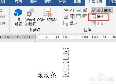 4、 插入滚动条控件,进入设计模式,选中后点击属性进行设置。