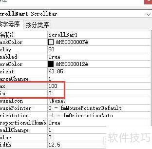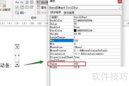 7、 点击设计模式按钮进入编辑状态,选中滚动条控件后打开属性设置,在属性对话框中查看当前Value值,当滑块移至最底端时,Value显示为最大值100。
