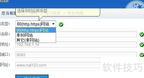 4、 开启nat123后,添加映射并选择对应的内网应用类型。若为网站,可选80端口或非80端口应用;其他服务则选择非80应用类型。外网访问地址填写自有的域名即可完成设置。
