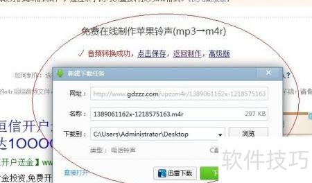3、 将已选好的MP3格式音频剪辑至40秒内,由于iPhone铃声需使用M4R格式,可进行格式转换。打开浏览器搜索M4R格式在线转换,选择可靠的在线工具,上传剪辑好的MP3文件,完成转换后将生成的M4R文件下载并保存至桌面即可。