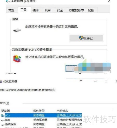3、 在盘符属性中,切换至工具选项卡,点击优化,进入设置后取消勾选按计划运行即可。