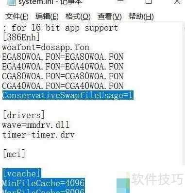12、 最后分享一段通过调整虚拟内存调用方式提升系统性能的设置方法。首先按下 Win+R 组合键,打开运行窗口,输入 system.ini 并确认,以编辑系统配置文件。在文件中的 区域末尾添加一行代码:ConservativeSwapfileUsage=1。该参数的作用是让系统优先完全使用物理内存,只有在物理内存耗尽后才启用虚拟内存进行数据交换,有助于提升运行效率。接着,在文件底部新增一个名为 的配置项(此节在 Windows 7 及 Windows 8/8.1 系统中通常已存在),并在其下添加两行设置:MinFileCache=4096 和 MaxFileCache=8096。这两项用于设定系统为硬盘文件读写分配的内存缓存范围,最小为 4MB,最大为 8MB。通过这种方式,可以有效优化机械硬盘在处理大量小文件时的读写响应速度,减少磁盘频繁访问带来的延迟。完成上述修改后保存文件并重启电脑,设置即可生效。该方法适用于追求系统响应速度和磁盘性能优化的用户,尤其对仍使用传统硬盘的设备有一定改善作用。