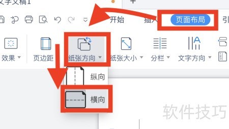 4、 调整页面布局,将纸张方向设为横向。