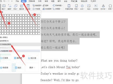 2、 将语言设为中文后,点击工具栏中的插入,在下拉菜单里选择表格,随后点击右下角三角符号,进入下一级菜单,选取文本转换成表格功能即可。