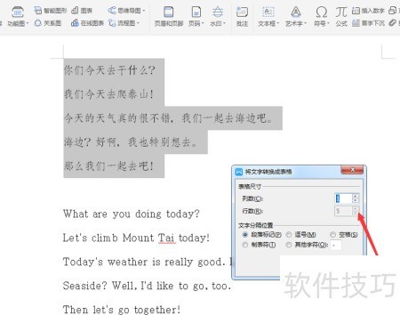 3、 在弹出窗口中选择文字分段位置,设置表格为一列五行。