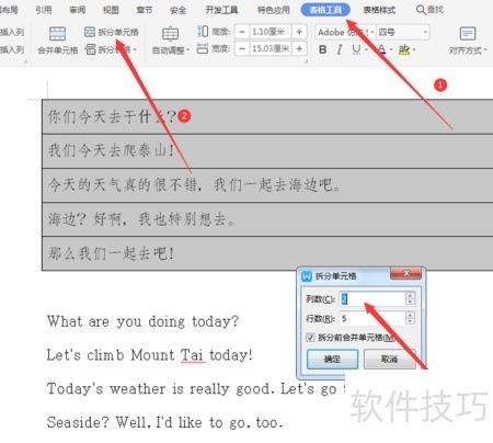 4、 选中整个表格,点击,从下拉菜单中选取,在弹出窗口中设置为2列5行。
