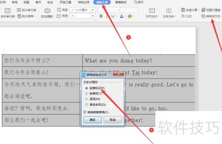 7、 选中表格后,点击,从下拉菜单中选择,在弹出窗口中勾选段落标记即可完成转换。