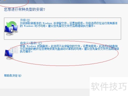 2、 所示,打开您想进行何种类型的安装窗口,选择自定义(高级)选项,开始安装全新的Windows系统。
