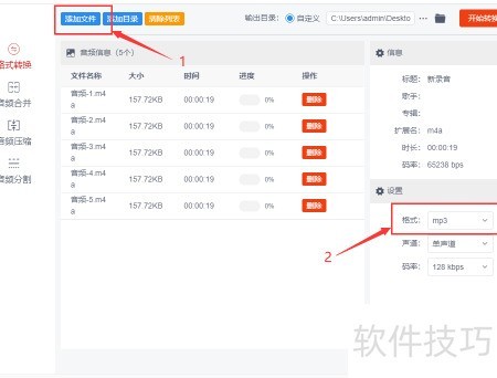 2、 点击按钮,批量导入需转换的m4a音频文件。在格式选项右侧的下拉菜单中选择mp3,即可完成输出格式设置,支持多个文件同时转换,操作简便高效。
