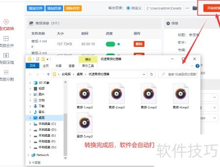 3、 第三步,点击软件右上角标有开始转换的红色按钮,启动音频格式转换。稍等片刻,待所有m4a文件转换完成后,系统将自动打开输出文件夹,所有生成的mp3文件均会保存在此目录中,方便用户查看和使用。