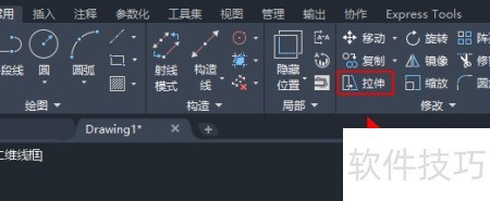 8、 切换至常用标签,于修改区域选取拉伸功能。