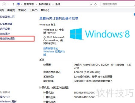 1、 点击Charm Bar中的设置,选择电脑信息,再进入高级设置,打开系统属性菜单。