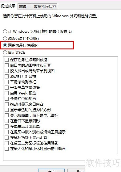 3、 勾选调整为最佳性能,并取消下方所有复选框。
