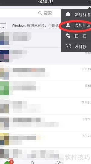 2、 打开微信,点击右上角加号,从四个选项中选择添加好友即可。