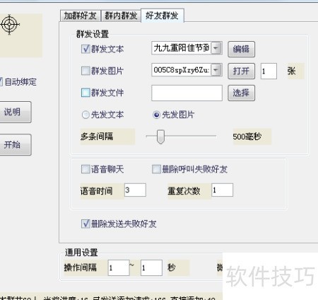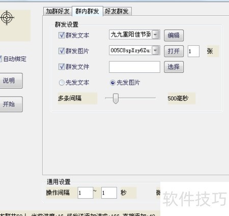 3、 群发消息:编辑好文字、图片或文件,勾选发送对象,点击开始即可完成群发。