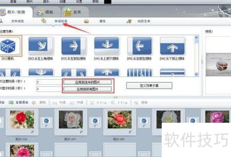 2、 点击转场效果,可选择多种图片过渡方式,如随机组合。每张图片显示及过渡时间均为2秒,效果所示。