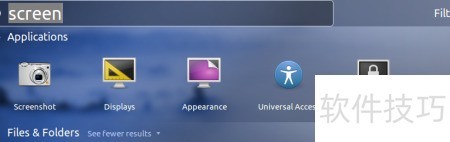 2、 在弹出窗口中输入screen,选择出现的Screenshot选项,此工具将用于执行截屏操作。