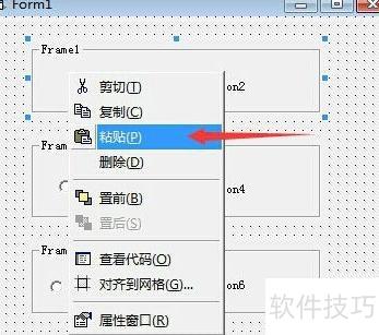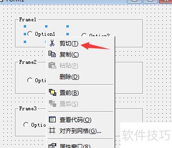 6、 若单选按钮通过双击添加,直接拖入框架无效。正确做法是:右键点击该按钮选择剪切,再在目标框架内右键粘贴即可完成移动。