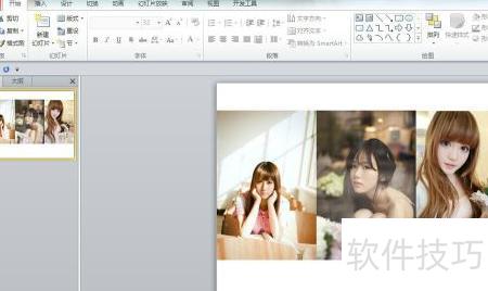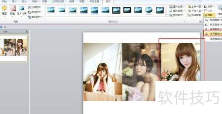 4、 选中三张图片,依次点击格式→图片样式→映像右透视,即可生成所示的相框排列效果。