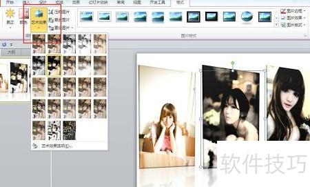 5、 选中三张图片,点击格式菜单中的艺术效果,选择画笔描边样式,即可轻松打造漫画风格的视觉效果。