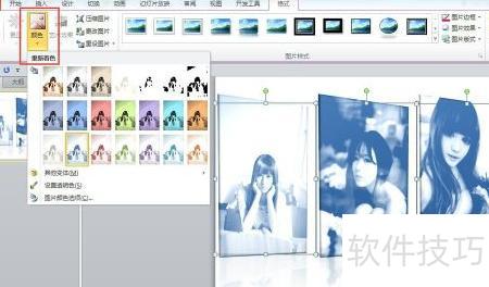 6、 选中三张图片,点击格式菜单中的颜色选项,选择所需色调,例如蓝色,即可将图片调整为类似黑白效果,呈现出独特的视觉感受。