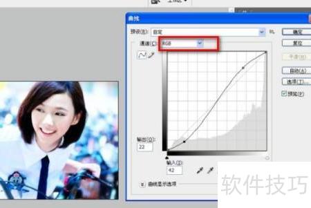 2、 按下Ctrl+L打开曲线调整框,选择RGB通道,提升高光亮度,同时进一步压低最暗区域,优化画面明暗对比。