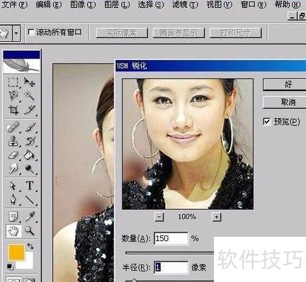 3、 执行滤镜菜单中的锐化—USM锐化命令,在弹出的设置界面中根据图像模糊程度调整参数,建议锐化数量设为150%,半径为1像素,阈值保持默认,以增强图像清晰度。