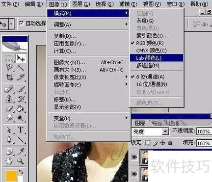 4、 完成第三步后,照片清晰度已初步奠定基础。随后在图像菜单中选择模式—LAB颜色,弹出窗口时点击拼合图层并确认即可。