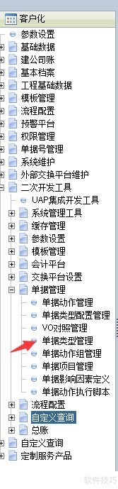 1、 进入客户化设置,选择二次开发工具,打开单据管理,点击单据类型管理并双击操作。