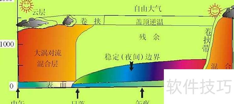2、 大气边界层是贴近地表的一层大气,直接受地面摩擦影响。当地面空气流动时,遭遇草地、沙石、作物、树木及建筑物等粗糙物体阻碍,产生摩擦阻力。这种阻力通过湍流作用向上扩散,随高度上升逐渐减小,至一定高度后影响甚微,可忽略不计。这一区域的厚度受地表特征和气象条件共同影响,通常可达数百米至一千米左右。