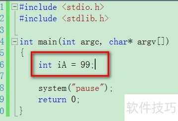 4、 声明整型变量iA并赋值为99,代码为:int iA = 97;