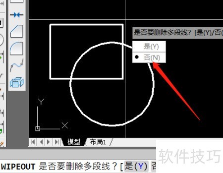6、 出现删除多段线提示时,选择否即可。