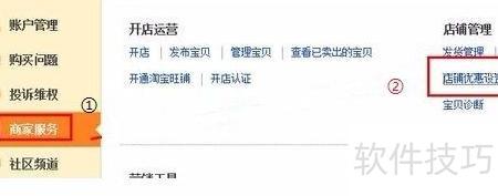 3、 进入服务中心后,左侧会显示菜单,选择商家服务,右侧找到店铺管理下的店铺优惠设置并点击进入。