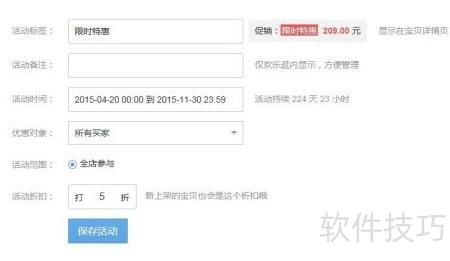 5、 填写活动名称、折扣力度和时间,确认无误后保存设置即可完成创建。