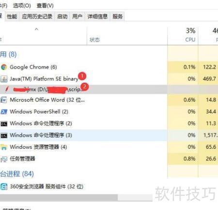 3、 打开任务管理器,找到Java(TM) Platform SE Binary进程,选中正在运行的JMeter进程,点击右下角结束任务按钮,即可强制终止该程序。