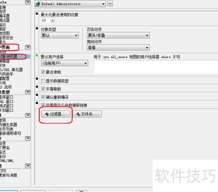 2、 操作:依次点击用户界面、对象浏览器和过滤器选项。