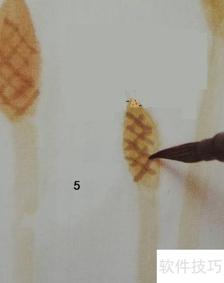 4、 用浓墨在穗子上勾勒纹理,先画斜线与驼色融合呈焦茶色,再从另一方向叠加交叉斜线,形成层次分明的肌理效果。