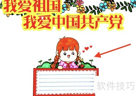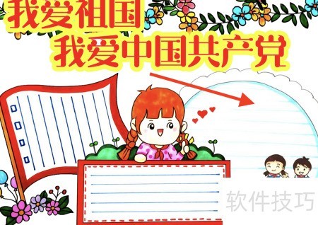 以庆祝花环、国旗和少先队员为元素,设计我爱祖国、我爱中国共产党主题手抄报,教你轻松绘制。