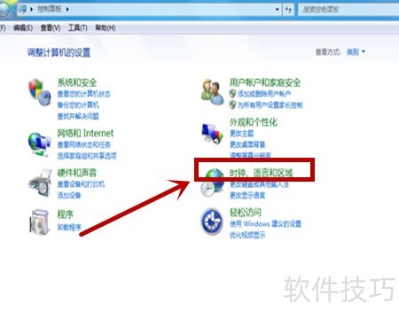 3、 进入控制面板,点击时钟、语言和区域设置选项。