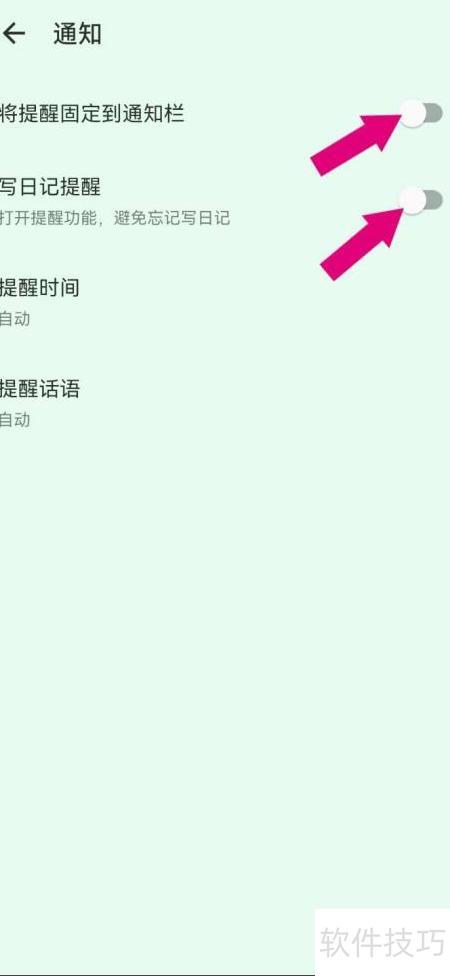 3、 关闭将提醒固定到通知栏和写日记提醒功能,即可取消系统在通知栏对我的日记提醒。