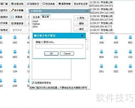 3、 在允许学生上网的基础上,可通过该软件限制访问的网站。进入主界面的上网控制功能,类似于软件管理,只需在黑名单或白名单中添加相应网址即可实现管控。