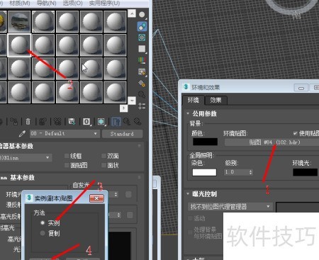 2、 按下快捷键M打开材质编辑器,将环境贴图拖入材质球,按住鼠标左键并选择实例复制,便于后续调整参数。