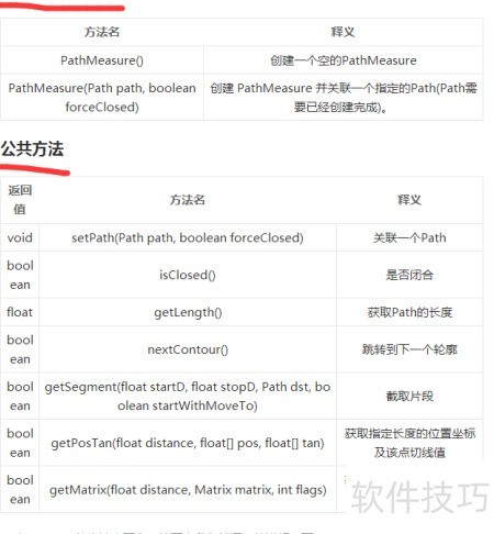 1、 先来认识一下可能用到的类:PathMeasure,它用于测量路径。图中展示了该类的构造函数及公共方法。