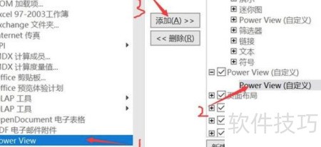 6、 在左侧找到Power View功能,点击添加按钮,将其加入右侧选项卡。