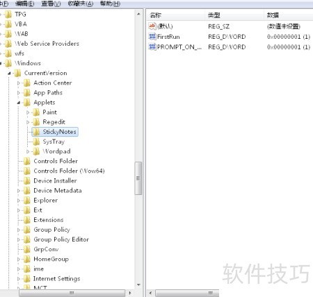 2、 在弹出的窗口内,定位并选择名为 StickyNotes 的文件夹,其具体路径为:HKEY_CURRENT_USERSoftwareMicrosoftWindowsCurrentVersionAppletsStickyNotes。请确保准确进入该注册表项,以完成后续操作。