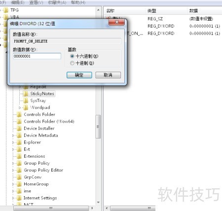 3、 进入StickyNotes文件夹后,双击PROMPT_ON_DELETE项,在弹出窗口的数值数据输入框中键入00000001(共七位零加一位一),确认无误后点击确定完成设置。