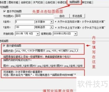 4、 在分区设置界面,切换至贴图插图选项卡,定位到壁纸插图区域。在插图内容栏中输入对应的代码,例如插图名为消防3.png,则填写|消防3.png_X_X(不含引号),完成后保存设置即可,具体操作可参考示意图。