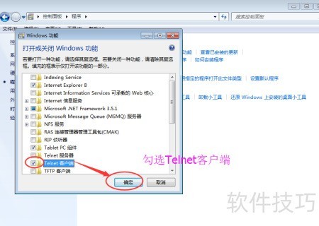 3、 开启telnet功能,进入打开或关闭Windows功能界面,按图示操作即可。