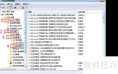 6、 依次展开组策略中的Windows设置、安全设置、本地策略和安全选项进行配置,操作步骤所示。